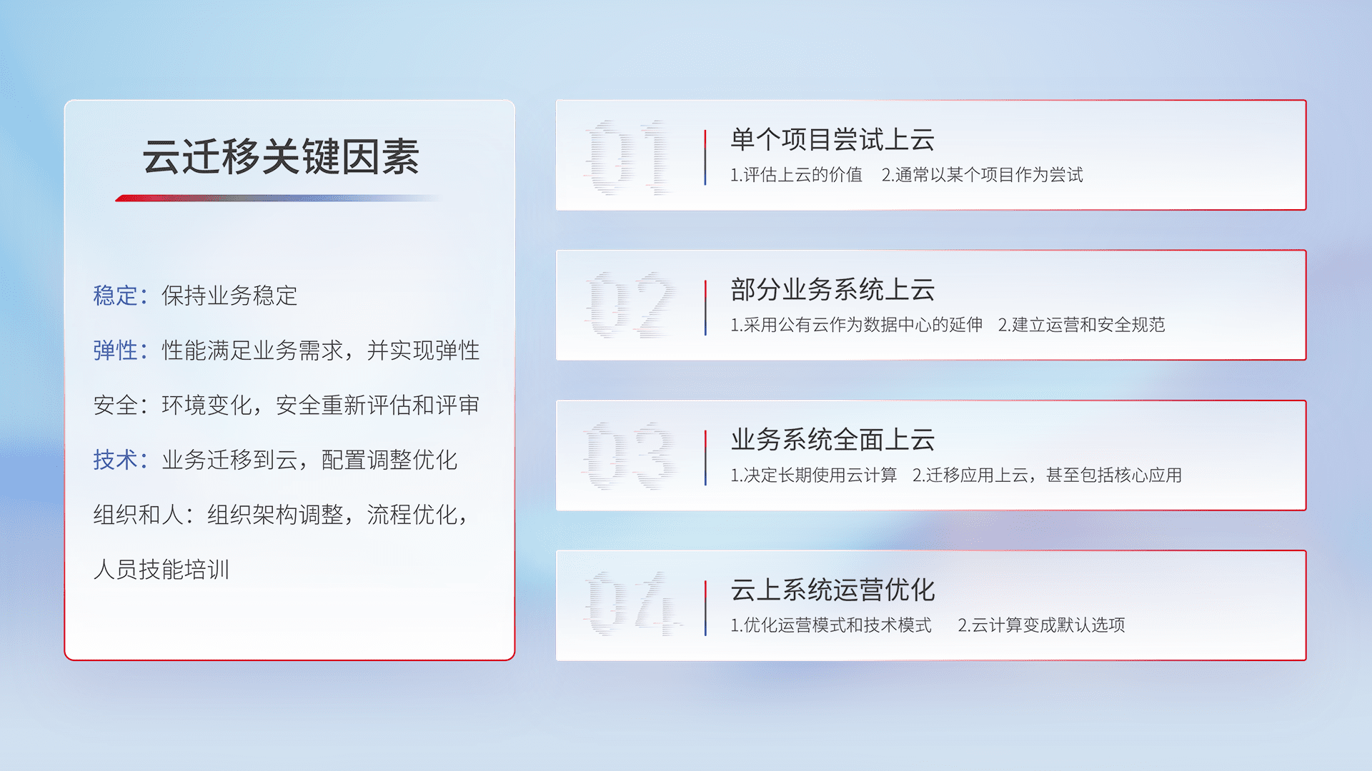 结合实际业务,,,从规划设计、、云平台选型、、云原生改造、、数据迁移、、、集成交付,,,,迁移全过程为客户识别最佳上云路径,,,做好风险识别管理,,,设计网络架构、、身份权限、、、、安全审计合规、、操作审计、、日志审计、、、监控告警策略、、多站点容灾设计等,,,对云上基础设施进行整体规划,,提升IT治理水平,,,,以满足弹性、、、、高可用、、、高性能的需求。。。。