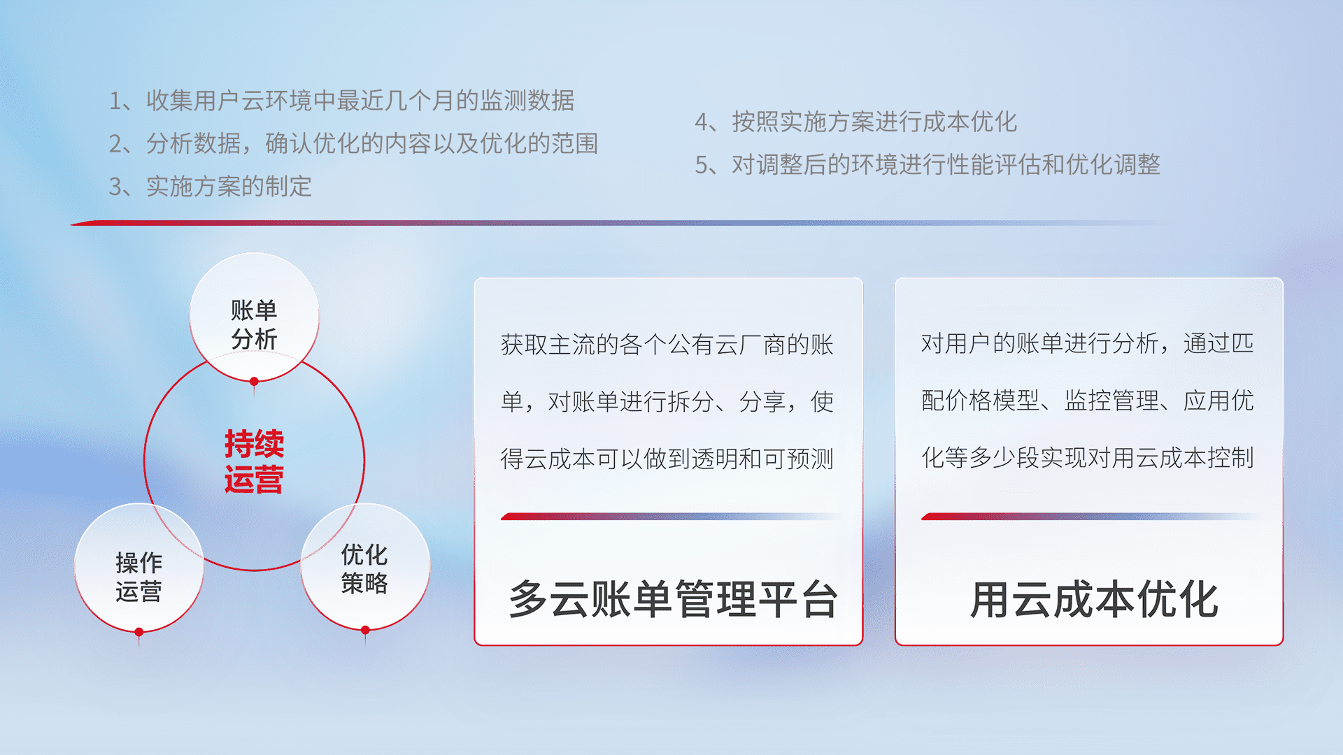 通过多云纳管,,,以统一的资源数据模型把客户的云资源进行抽象和封装,,进而实现对多云资源的统一操作,,,保障云资源管理的可靠性、、、、稳定性与可用性。。。。量身定制化运维内容,,,配置、、、、开发运维、、、补丁管理、、、、备份、、、、监控、、认证和访问管理、、、、审计和日常巡检等,,保障在用云过程中的可靠度,,,稳定度以及高可用率。。。。